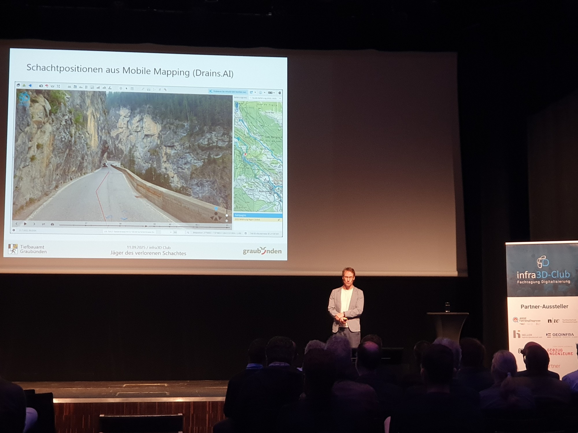 In seinem Vortrag erläuterte Mathias Ulmer, wie digitale Werkzeuge die Erfassung und Bewirtschaftung von Infrastrukturobjekten unterstützen. Auf den 1’350 km Kantons- und 220 km Nationalstrassen, die durch das Tiefbauamt Graubünden unterhalten werden, befinden sich rund 46’000 Schächte (erwartet) zur Strassenentwässerung. Mithilfe von infra3D lassen sich diese bei regelmässigen Befahrungen effizient sichten und kontrollieren.