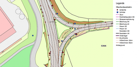 Als Grundlage für die Bestandserfassung wurde eine Teilstrecke der Oberlandautobahn A53 im Auftrag des Ingenieurbüros Basler & Hofmann in Zürich befahren. Anstelle konventioneller Vermessungsmethoden wurde für die Erfassung von Strassenmarkierungen, Schildern, Schächten, Rückhaltesystemen, Randsteinen, Zäunen, Bruchkanten etc. die infra3D Platform von iNovitas eingesetzt. Dank den hochaufgelösten, dreidimensionalen und georeferenzierten Bildern konnten sämtliche Arbeiten digital am Arbeitsplatz ausgeführt und in den geforderten Formaten für die weitere Bearbeitung extrahiert werden.